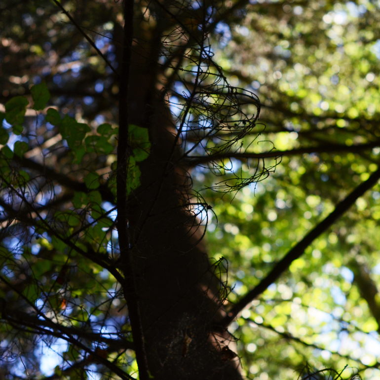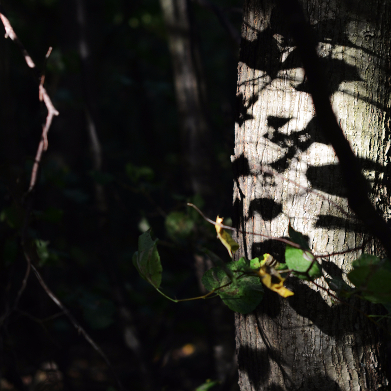 на самом деле, я пошла в лес за ветерком: мне страшно нравится, когда он играет листьями и тенями. Я могу часами, мне кажется, смотреть на стволы с картинками и слушать, о чем говорят листья) Взяла у мужа телефон, в моем давно не хватает памяти для видео( Для фото, впрочем, тоже: я удаляю две старых картинки, чтобы сделать одну новую. И мне грустно)