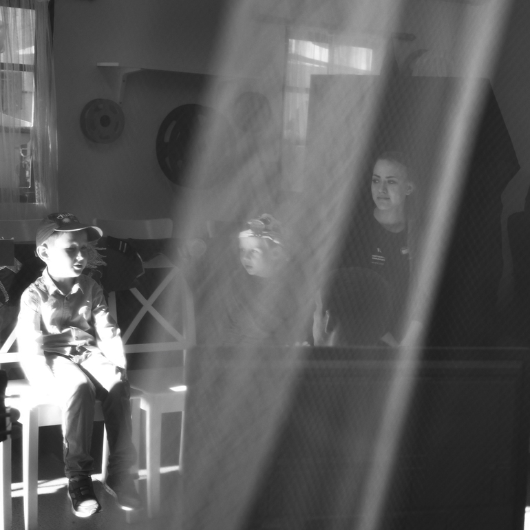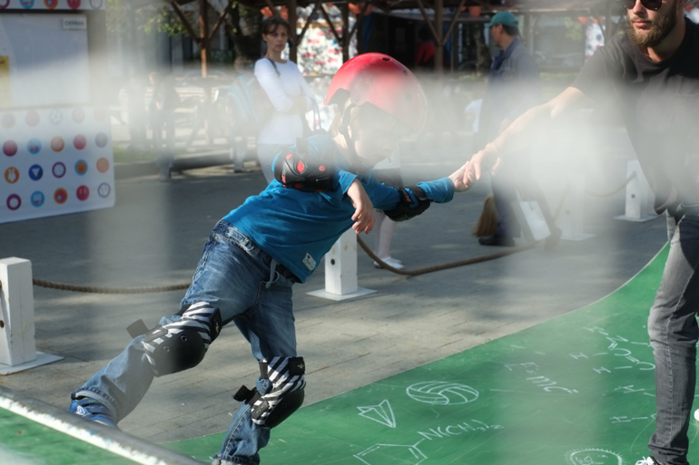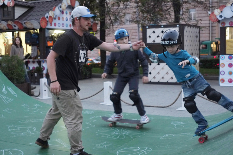 На скейте он с инструктором. Там рампа такая... В общем, пока ещё за руку.