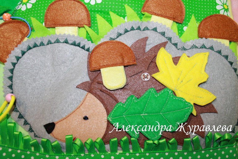 Вот ёжик вышел за грибочками. Научите малыша прятать грибочки в кармашки, или надевать на ежика. Посчитайте грибочки.