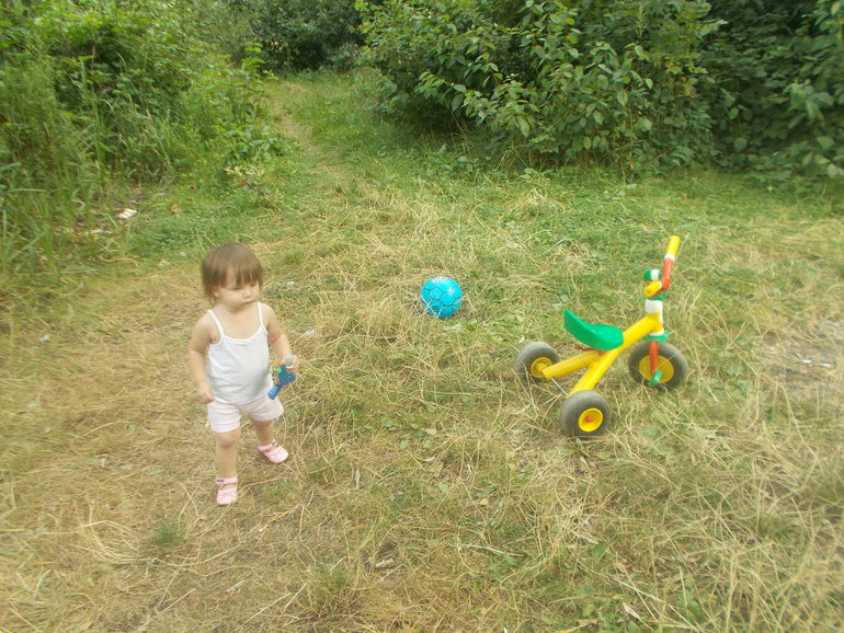 Практически научилась сама одеваться и обуваться - в 90% случаев верхнюю одежду одевает на верх (часто запутывается в рукавах, психует, и все такое, но понимает, что футболка или рубашка - именно на верхнюю часть туловища). Штанишки, шортики - исключительно на ножки пялит. Носочки одевает (хоть и задом на перед порой получается).