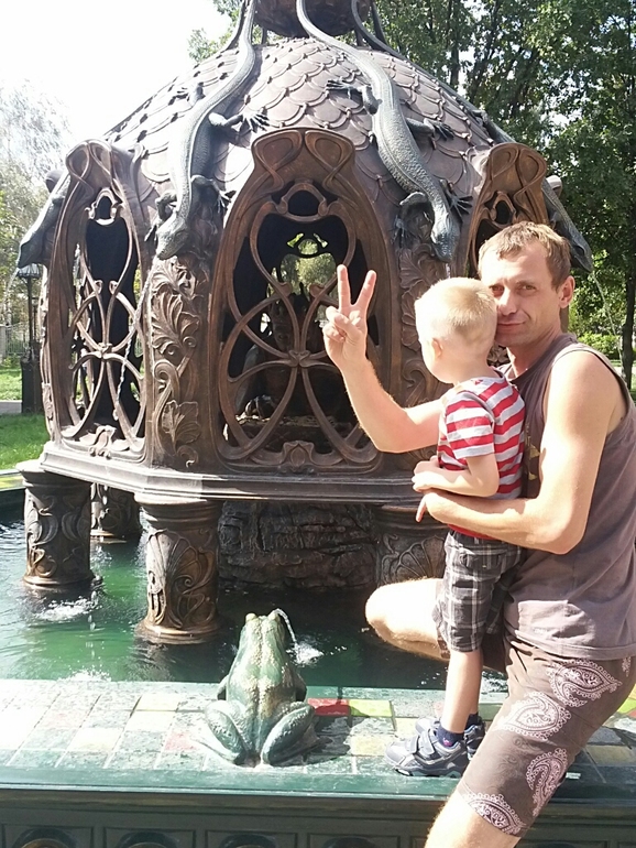 Вчера были на потрясающей площадке. Куча горок, домиков, качелей, веревочный городок, огороженный сеткой. Фонтан с Кощеем, который над златом чахнет. Дуб с котом ученым. Красота. Естественно, потащили Диму полазать по веревочному парку. Далее тако1й разговор