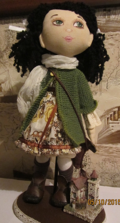 Одета в нижнее платьице, сарафанчик, белые колготочки, вязаное пальтишко с капюшоном и шарфик. На ножкам кожаные ботиночки. Носит коричневую сумку через плечо.