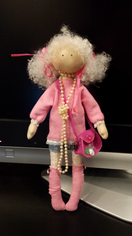 Девочка-модница, ростом 36 см с длинными каштановыми косами, и в модном сарафанчике с трикотажной накидочкой ищет себе подружку, для приятных прогулок по магазинам (имеет для этого большую сумку)!