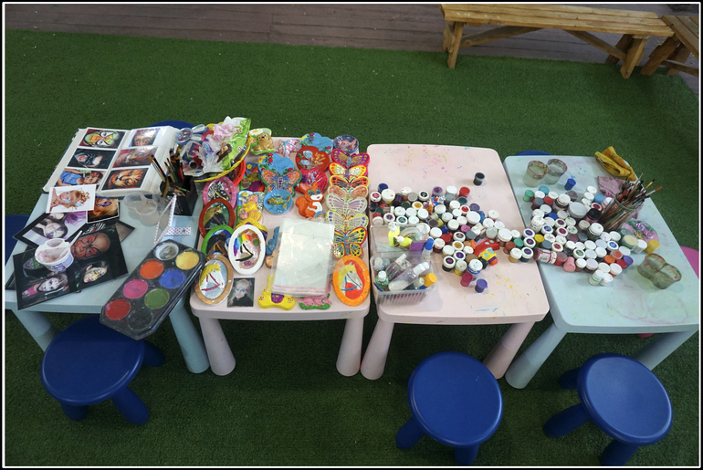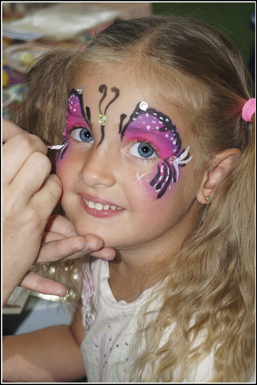Аквагрим очень качественный. Я не очень люблю такие вещи и это, кажется, третий раз, когда я согласилась на него, и оба предыдущих раза, во-первых, безнадёжно была испачкана одежда, во-вторых, дети ныли, что чешется, и в-третьих, нарисованное на холсте лица не очень-то походило на репродукцию того, что предлагалось в каталоге. Это как на али экспресс иногда фотографируют не платье, которое продают, а фото, по которому шили в темноте и с завязанными глазами. И складывалось ощущение, что надрали картинок из интернета, а воспроизвести их пробуют впервые. Художница же имела толстенький фотоальбом со своим портфолио и глаза разбегались. Миша сразу чётко выбрал себе тему бэтмена, Серёжа немного пометался между тигрёнком и человеком-пауком, а Лера надолго залипла над пятью снимками не в силах отдать предпочтение чему-то одному.