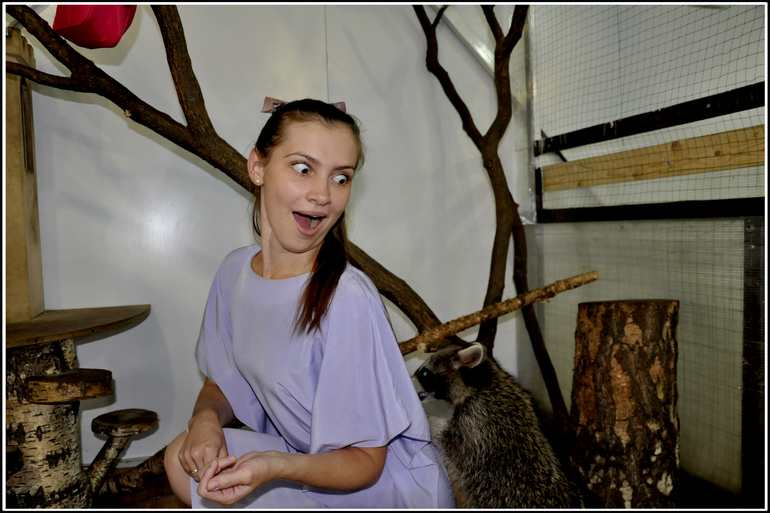 Мне тут недавно знакомая предлагала съездить в обычный зоопарк, но что-то я так подумала, пока за руль не сяду и не буду на колёсах передвигаться со всем выводком, на фиг. А вообще, я не люблю зоопарки, пусть папа водит 1-2 раза в год. А я лучше сюда, в контактный! К птичкам и енотам.