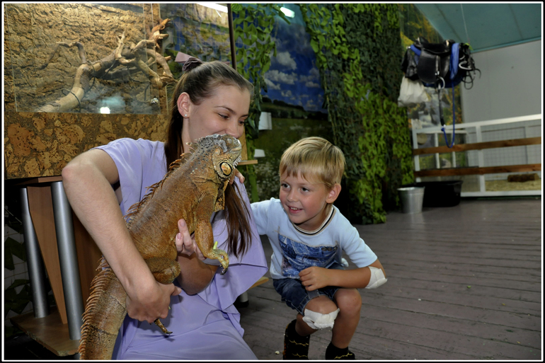 Прикольной, при всём моём настороженном отношении к рептилиям, показалась игуана. В прошлый раз мы общались исключительно телепатически посредством визуального контакта через стекло, а сейчас я что-то осмелела и попросила у гигантской ящерицы позволения подержать её. Ящерица не ответила, но сотрудник зоопарка взглянул на меня с нескрываемой жалостью открыл террариум. Игуана не то чтобы с энтузиазмом восприняла моё приглашение, но и не сопротивлялась.
