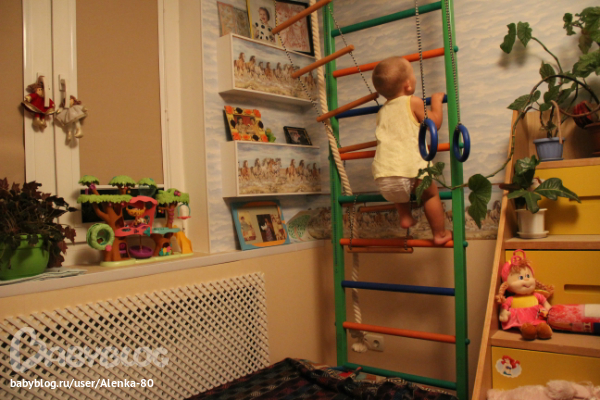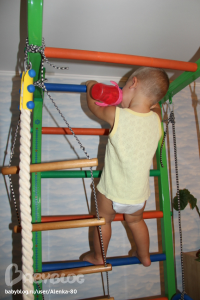 С поильником круто! у меня точно так же , только когда он один в Аниной комнате он на лестницу не лезет, только когда кто то есть в комнате, тоже мигом до самого верха и ржёт довольный, потом прыгает в руки тому кто внтзу стоит.Но и спускаться тоже сам умеет, только нам страшно ,страхуем всегда, вдруг оступится.Мы не запрещаем, наверно поэтому уже болле спокойно относится к шведской стенке.