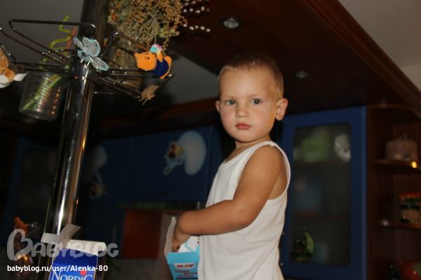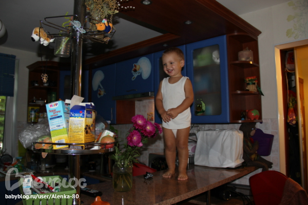 утро,в течении двух минутного отсутствия мамы в туалете,умудрился залезть на барную стойку и начать потрошить кухонные шкафы...