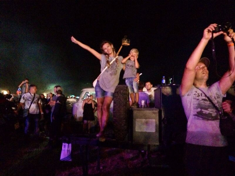 Устроились шикарно, на полевой кухне))сначала там поужинали гречневой кашей ,позже и на машину сверху залезли. Самые шикарные места, по середине и видно и сцену и экран и всех людей .