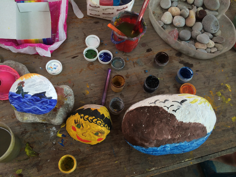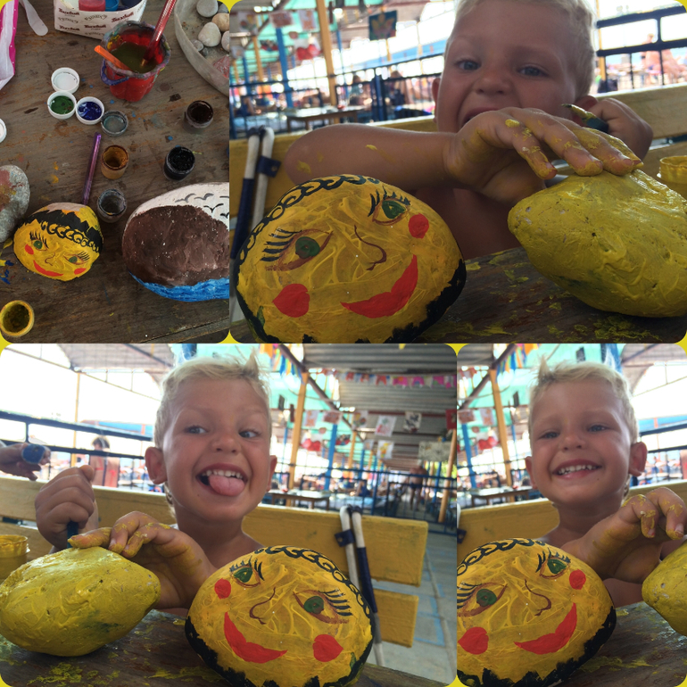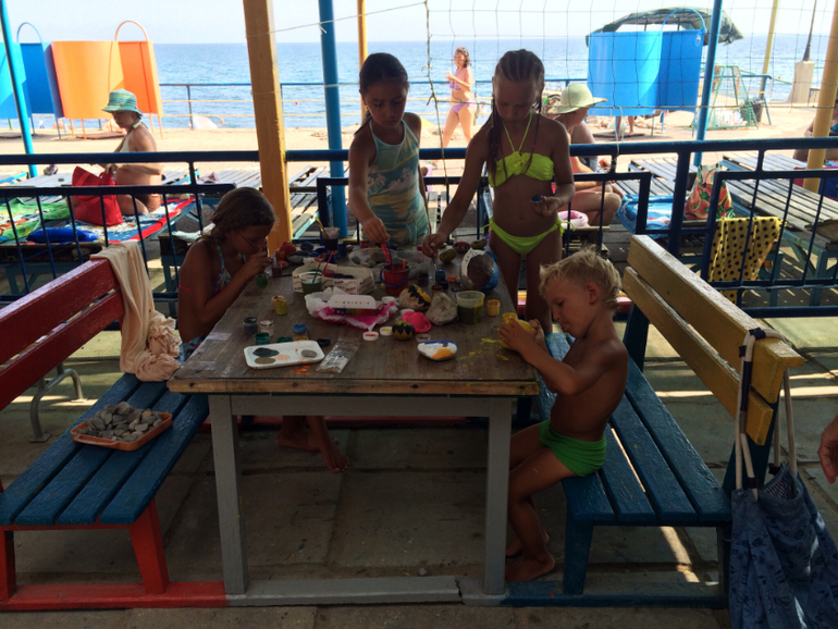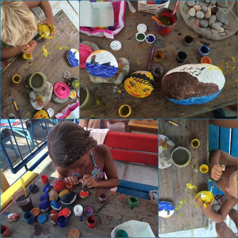 Рисовали гуашью на камнях . Ангелина божью коровку, я русалку , гору и Ратмира - подсолнух, а Ратмир все камни в желтый цвет. А что, если цвет нравится?!)))) хорошо поиграли, я сама очень увлекалась когда начинаю рисовать... И удобно рисовать на пляже , потс просто все мыть