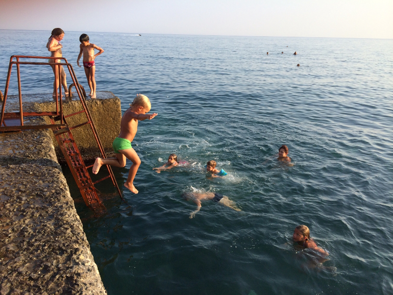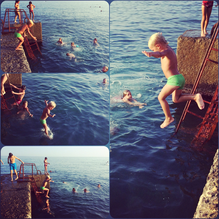 Научился плавать сам. Сначала научился нырять и плыть, потом глядя на Ангелину стал пробовать над водой плыть , а потом и Егор добавил, тоже хорошо плавает . Так что пример заразителен,так как Ратмир все время хочет быть на ровне со всеми , а то и лучше- пришлось научится. Прыгать стал сам с буны, решил так и все! Я сначала внизу у лестницы страховала , он прыгал я вылавливала за ухо))) но человеку такой расклад не понравился , кричал Я Сам! И все . Прыгает сам- плывет сам! И так миллион раз)) каждый его прыжок, выныриваете и доплывание до лестницы , для меня рубец на сердце. Но стою, хвалю и горжусь. Пусть мужик смелый растет!