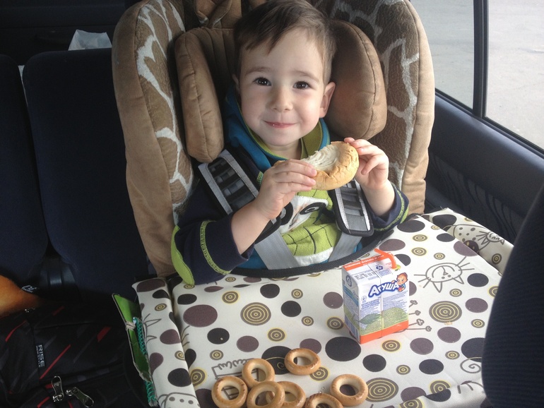 Выехали не рано, нужно было закончить дела, но до воронежа долетели за 5,5 часов. Трасса очень хорошая, много участков магистрали. Миша в первый день вел себя вообще великолепно. Очень украшал быт столик на автокресло. Он из плотного но мягкого материала. Рисовать на нем полноценно нельзя, а вот разложить игрушки, наклейки, еду очень удобно.