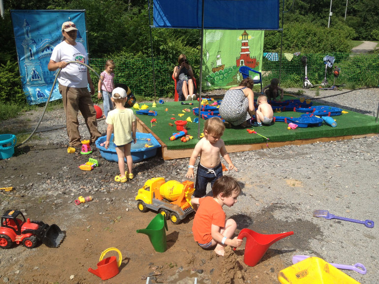 В прошлом году летом Паровозия базировалась в музее РЖД. Я писала об этом тут. А в позапрошлом - в Филях - об этом тут. Тогда все было намного более рафинировано - мощеные дорожки или доски. А сейчас - дачное счастье. Грунтовая площадка, песок, вода. Дети мокрые, грязные и счастливые:))))