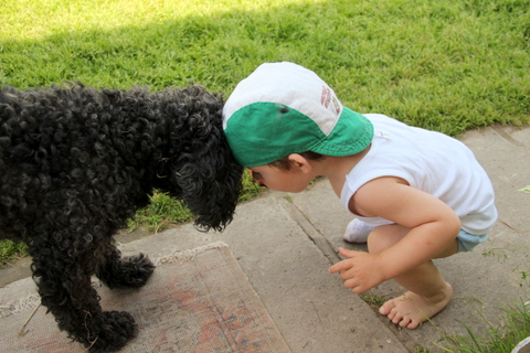 Бодается с дачным псом Клепой, совсем его не боится, хотя пес его уже раз за руку цапнул:
