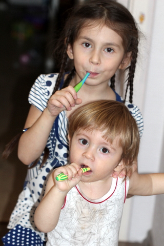Берет пример с сестры и требует себе зубную щетку, когда мы все вечером чистим зубы. К слову о зубах: сейчас вылезли все резцы, четверки и клыки медленно, но верно уже торчат.