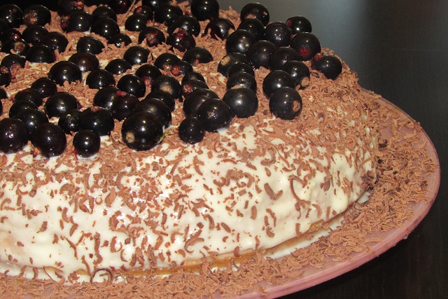 5. Сверху натираю шоколад и выкладываю смородину. Можно использовать любые ягоды, я выбрала смородину т.к. она придает кислинку, получилось отличное сочетание сладкого и кисленького.