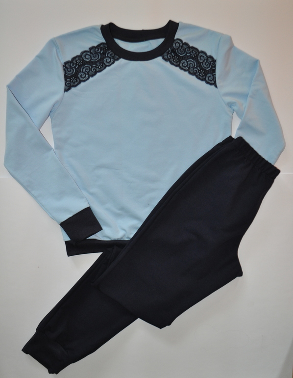 Этот комплект для дома тоже стал моим любимчиком:) Мне нравится и сочетание темно-синего с нежно-голубым, и неброский декор в виде эластичного кружева. Есть вещи, которые шить как-то особенно приятно -- этот костюм как раз из таких.