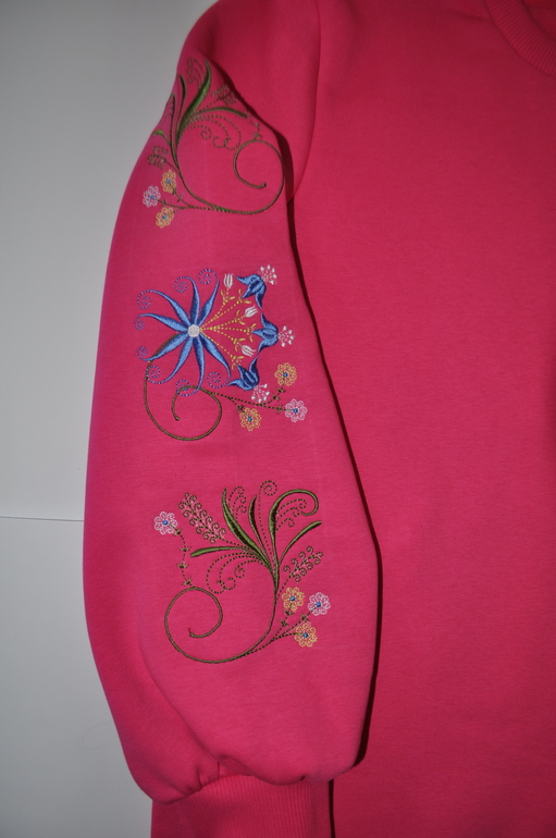 А это платье я особенно полюбила:) Уютная трехнитка с начесом яркого малинового цвета, в которой так тепло будет с наступлением холодов. Рукава платья присборены внизу и украшены машинной вышивкой.