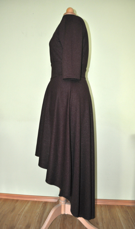 Первым был царственный комплект из креп-дайвинга марсала. Ассиметричная юбка-полусолнце на молнии с широким поясом и кофта (?) с рукавом 3/4.