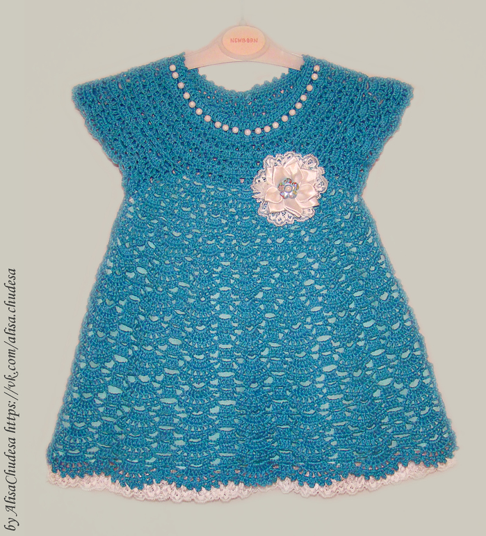 Авторское платье "Лолита" на 4-6 лет, пряжа голубая Нарцисс от Кировского комбината 100г-400м и Пехорка "Успешная" 50 г -220 м, 100% хлопок, крючки 2 и 2,5