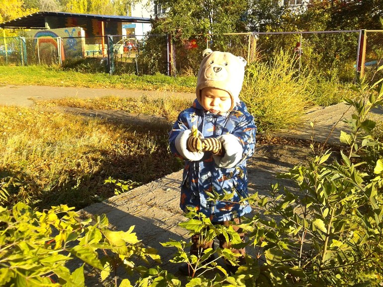 Утром ему легко можно "заговорить зубы".(в отличии от Алёны в том году!!),поэтому по утрам я не переставая разговариваю с ним,картинно охаю,ахаю,что-то придумываю,на улице показываю все-все-все,начиная от травки,заканчивая птичкой,услащаю путь до сада конфеткой,в группе мы уже изучили все картинки и предметы..