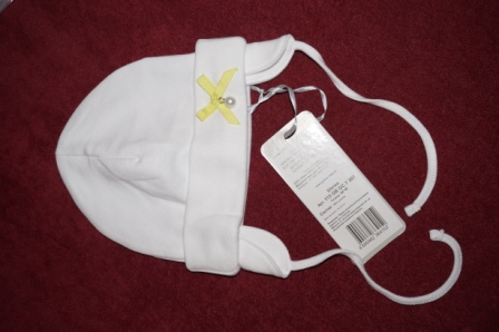 Белая хлопковая шапочка (ОГ 46-48) с лаймовым бантиком и жемчужинкой. Надежно закрывает ушки малыша