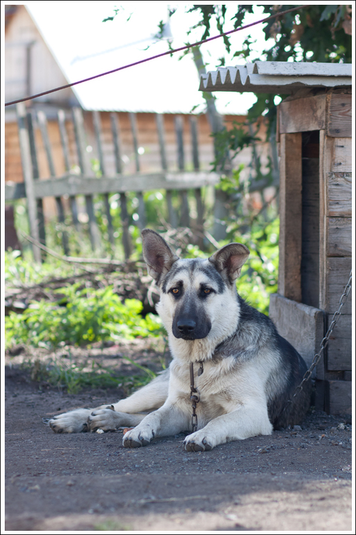 Ему около года. Свекровь его маленьким щенком подобрала на заброшенных дачах где-то. Сам к ней вышел. Мы когда приезжаем, его на цепь садят. Он не кусается, но прыгает на всех, Саша боится, приходится убирать. А так он везде бегает. Я его сама боюсь. Летом то лук мне раскопает, то морковь потопчет, засранец.