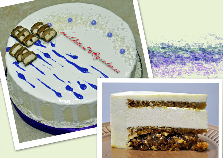 Внутри морковный бисквит с карамелью,орехами,медовым и сливочно-сырным муссом.