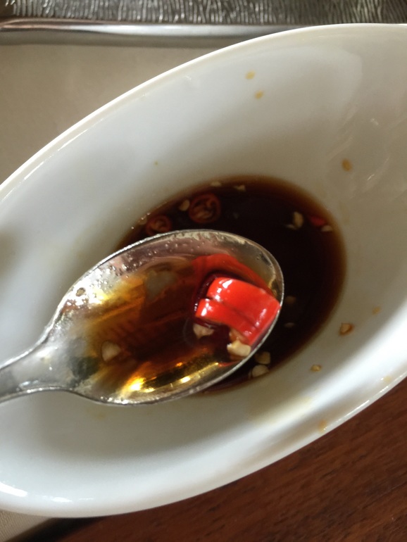 И моя любимая острая заправка - соевый соус и перчик Чили .