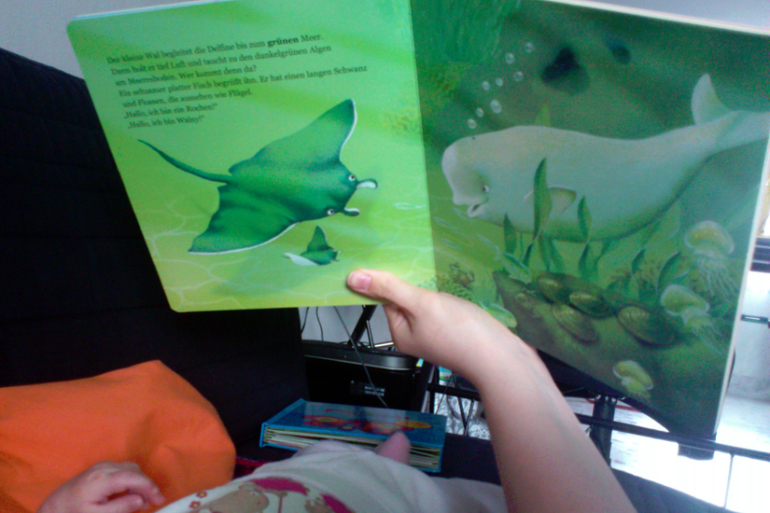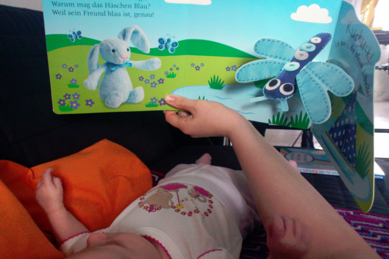 Так же в два месяца уже можно показывать книги настоящие.главное что бы они были большими. Рисунки должны быть яркими и сочными. Крупными. Еще лучше если одна страница выдержана в одном цвете. У нас специальные, по которым дочка позже будет учить цвета. Текст нам не интересен, это все позже. Главное занятие для глазок. Мы правда их смотрим не на животике, а просто так. Дочке нравится. Улыбается на желтый и фиолетовый цвета.Удивляется зеленому и красному))