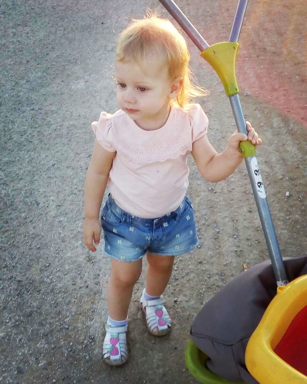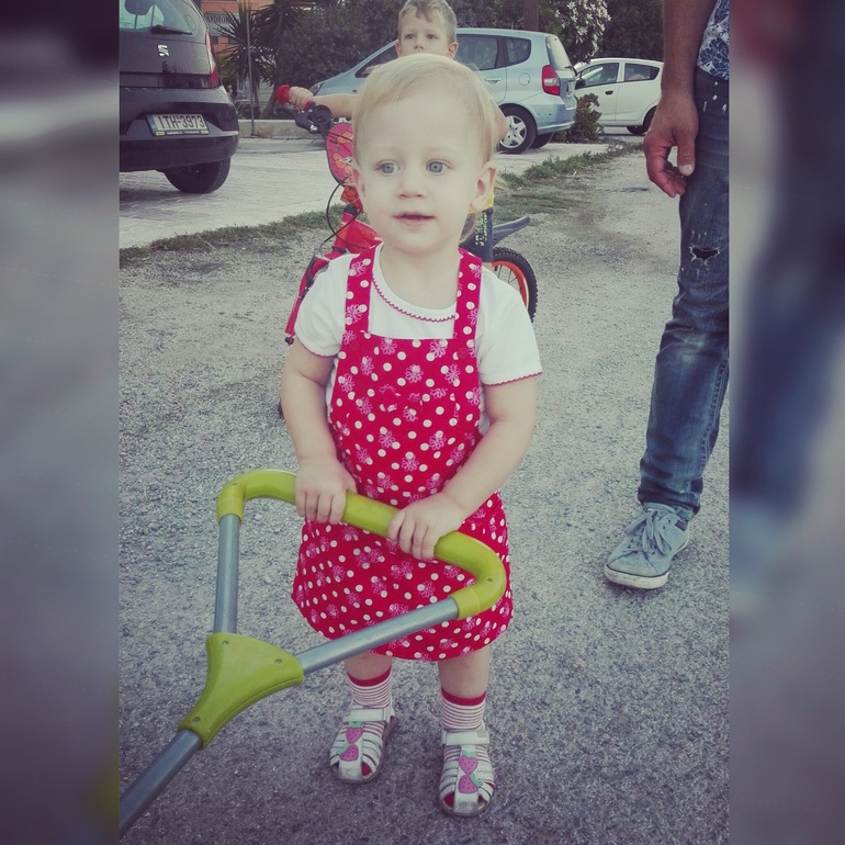 Перестала сидеть в коляске, уже месяца два как. Стали гулять на велосипеде с ручкой, так она теперь и оттуда сбегает. И нет бы шла ножками рядом, так ей надо бежать абсолютно в противоположную сторону, забегать в каждое кафе или бар, мыть руки в лужах и прочее.. Короче, гулять спокойно стало невозможно.