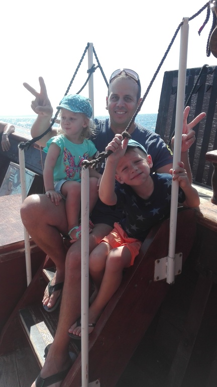 В прошлые выхи ездили на остров Куфониси, необитаемый остров, чистая вода, обещали и анимацию на корабле и острове. ПОехали мы. Выехали позже, чем планировали, ехать было около двух часов до порта. На полдороги Лену укачало, стало рвать.. Думала, не успеем на корабль точно. Но ничего, успели, забежали, поехали. 1.15 где-то плыть. Мест в тени не осталось, сели на солнце, напекло, и даже меня укачало чутка. Купались в открытом море с корабля сначала, дети с нарукавниками, ничего не боялись, прыгнули и поплыли. Потом уже на самом острове расположились, там купались, дети на корабле рисовали карту сокровищ, а потом на острове искали клад с лопатками. Нашли, там были конфетки, которые тут же и уговорили. А на обратном пути поднялся ветер 6 Бофор, не сказать что шторм, но ощутимо. Еле доехали! Умотались жутко. Дети уснули еще на корабле, а мы доехали до дома, не стали их будить, в душ и тоже отключились. Красиво, но ооочень далеко!