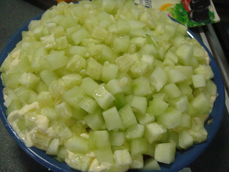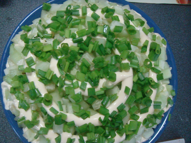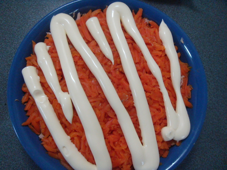 Натереть на слой рыбы морковку на крупной терке, сдобрить майонезом: