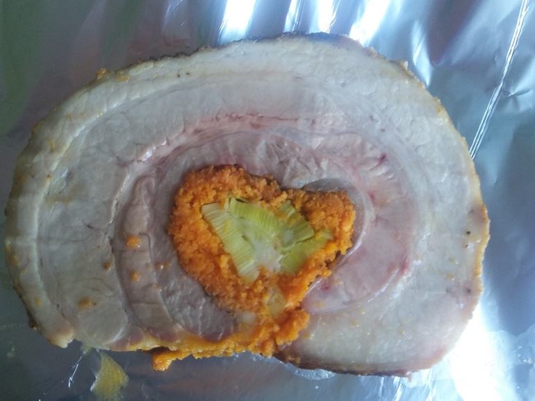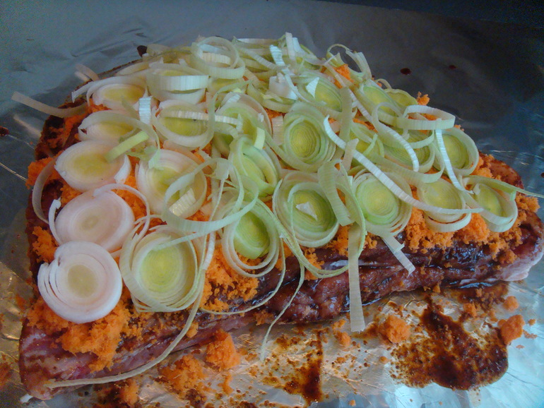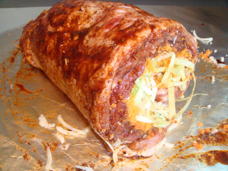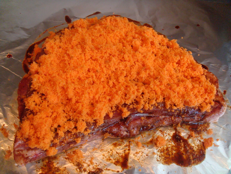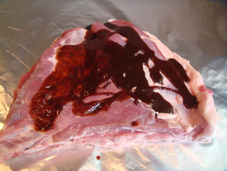 Натираем этим маринадом кусок свиной грудинки (или пашины, беконной части):