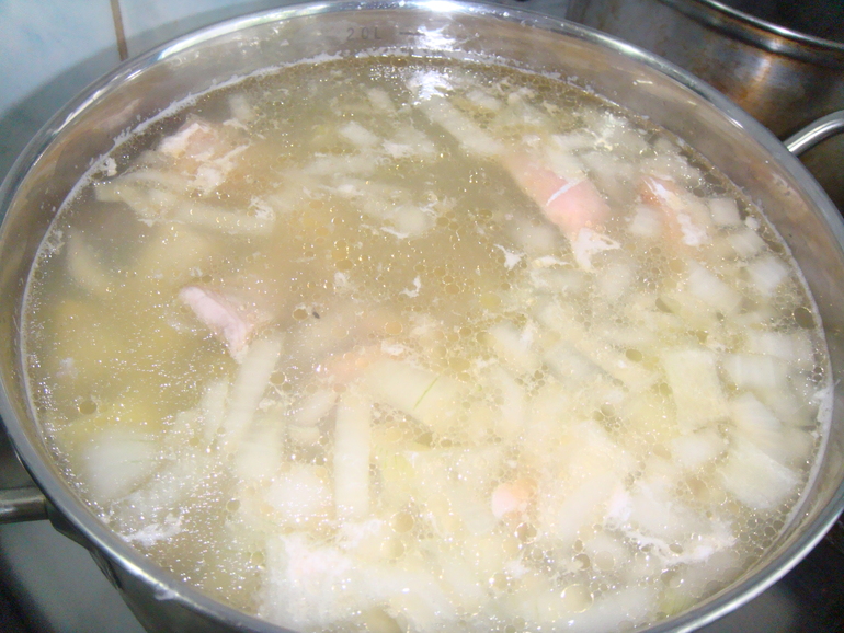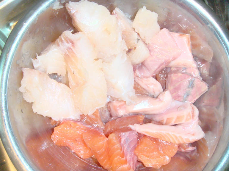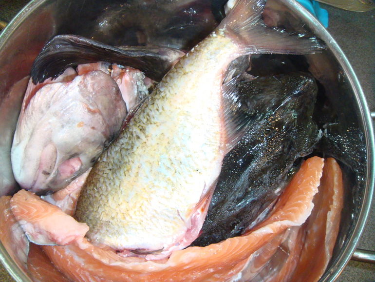 Всю рыбку почистить. Филе форели ушло на засолку. Середина стерляди тоже готовилась по-другому. В кастрюлю сложить мелкую рыбку и все отходы крупной, предварительно срезав все мясные кусочки: