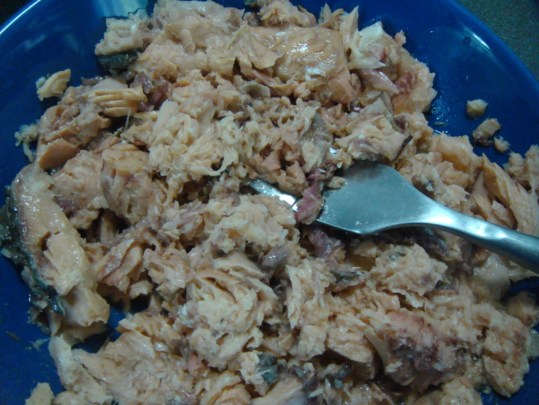 Банку рыбных консервов (натуральных или в масле) размять вилкой: