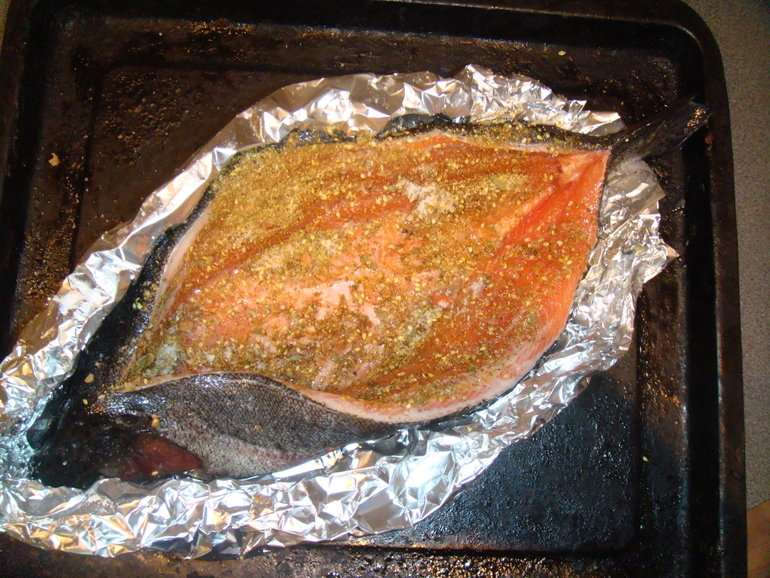 Вынимаем хребет и потрошим рыбу через спинку. Голову и хвост оставляем. Рыбу уложить на противень в форму из фольги: