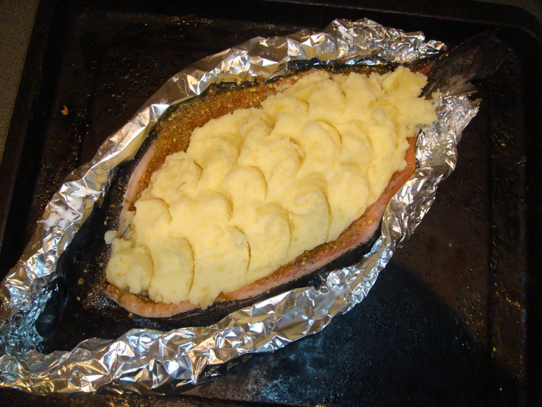 Затем взбиваем миксером, добавив 1 яйцо и кусочек сливочного масла. Пюре готово. Закладываем пюре в рыбу, делаем ложкой чешую: