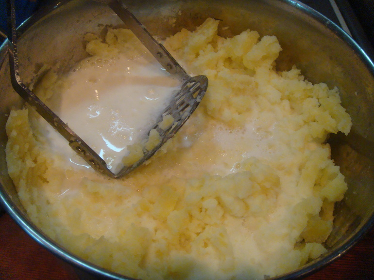 Отвариваем картошку с солью. Сливаем воду, разминаем, добавляем сливки: