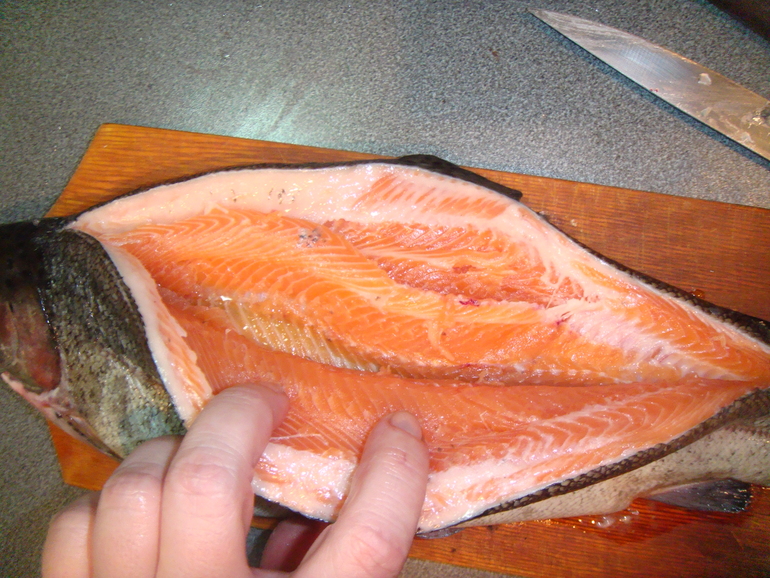 Форель (семгу, горбушу) обязательно покупаем не потрошеную:
