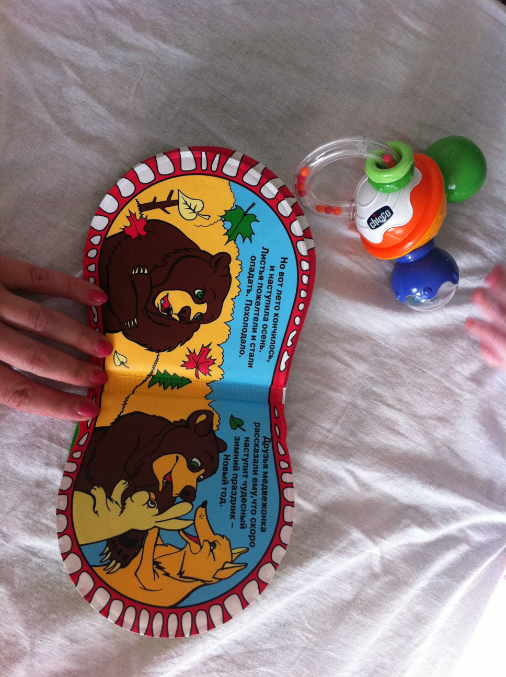Для истории: сфотографировала Милана любимую игрушку. Среди всех игрух только она обладает волшебным успокаивающим действием. Не даром подарок сестрички на 1 месяц от рождения. (зубки выглядят немного зловещееее)))) (это книжка с которой можно купаться)