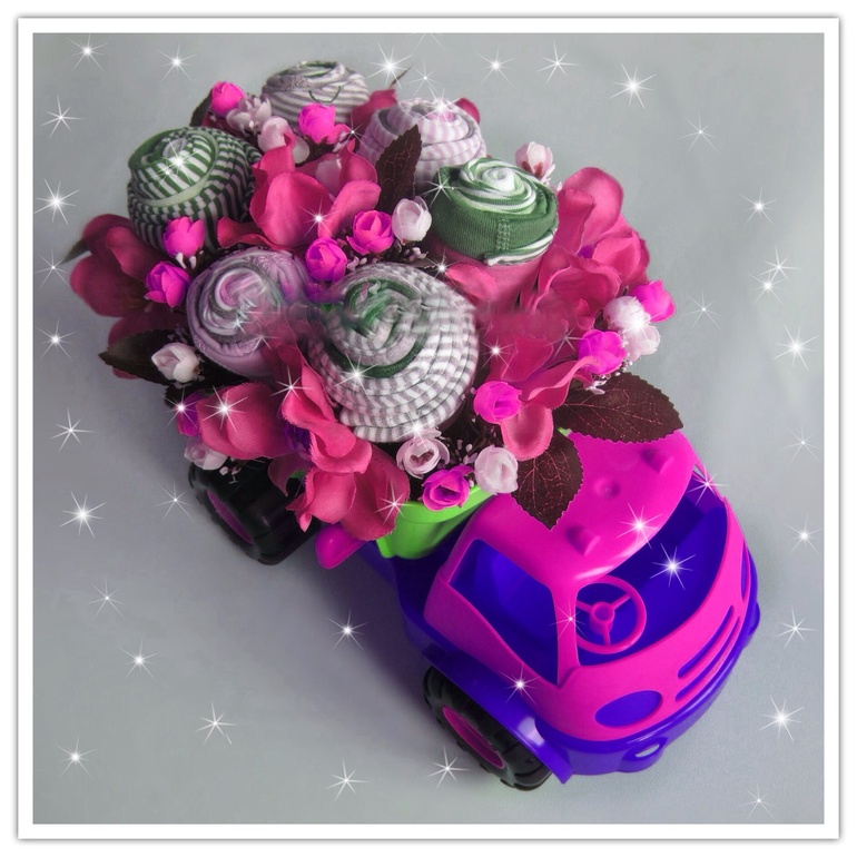 Рождение ребенка, крестины, именины, первые дни рождения -события, которые родители малыша ждут с особым трепетом. В эти дни важно подарить подарок, который запомнится и будет оценен по достоинству. И таким подарком может стать букет из детской одежды в виде машинки , композиция которого собирается из боди, чепчиков, ползунков, пинеток и других вещей.