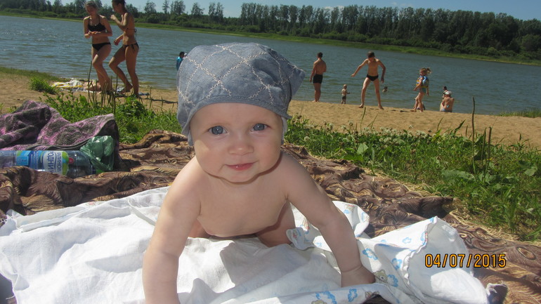 В прошлом месяце мы успели позагорать и искупаться) Нике ножки помочили, мальчишки купались во всю)