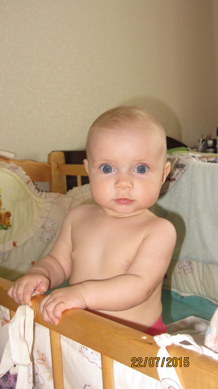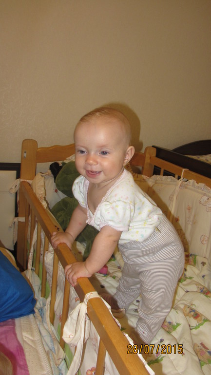 Но моей малышке этого оказалось мало и она встала на ножки... естественно, я переживала и долго стоять не давала, но сейчас эта шишига переступает вдоль кроватки, матрасик опустили ниже, т.к. пару раз был совершен побег из кроватки.