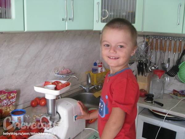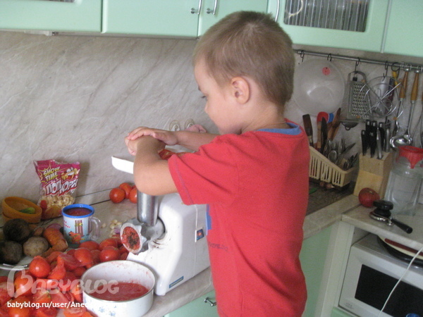 Хорошо, когда есть помощнички))) Мы делали не сок, а кетчуп - сначала варили, а потом перетирали через сито. Сок тоже люблю без семечек, но сама не делаю, у меня свекровь в этом деле спец)