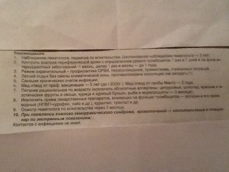 У нас были низкие тромбоциты 10 (!) и по недосмотру участкового педиатра мы месяц не знали об этом и не получали лечения. После этого проходили лечение в Морозовской в гематологии, но тромбоциты опять падали до 40.