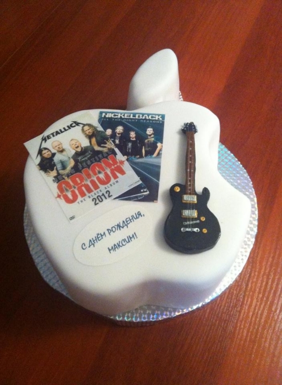 Такой тортик в виде логотипа apple с гитарой. Гитара полностью съедобная, даже струны - карамельные.