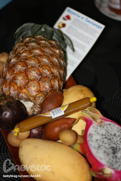 Вчера наша бабушка вернулась из отпуска. Ездила на 2 недели, говорит, впечатлений куча - полодительных, конечно, гораздо больше))) Привезла нам вчера такую вот вкуснятину. Да, в Москве таких фруктов не поешь....ананасы и манго совершенно другие - они ВКУСНЫЕ и СЛАДКИЕ :) А стоит это все в Тайланде просто смешных денег, например, ананас в Патайе стоит 40рублей, а на трассе вообще продаются за 10рублей. Ну где в Москве купишь спелый ананас за 10 рублей :)