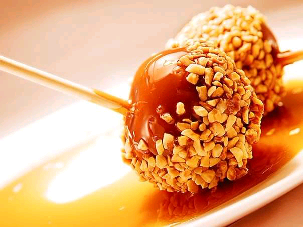 Вставляем в сердцевину яблок палочки и осторожно окунаем их в карамель, после чего макаем тут же в приготовленные украшения: для этого размельчим орехи, шоколад, или приготовим просто цветную посыпку. Тут уж полагаемся на Вашу фантазию и изобретательность!