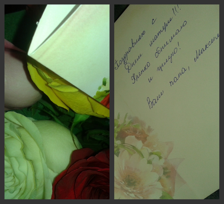 БМ вчера вечером спрашивал мой адрес здешний. Я еще подумала, что хочет Соф подарок на НГ выслать, дала. А сегодня утром курьер принес цветы)) В букете открытка с запиской "Поздравляю с Днем матери! Крепко целую и обнимаю! Ваш папа Максим!" Было приятно, о чем я и написала ему смс сразу, что "спасибо за цветы, очень приятно".